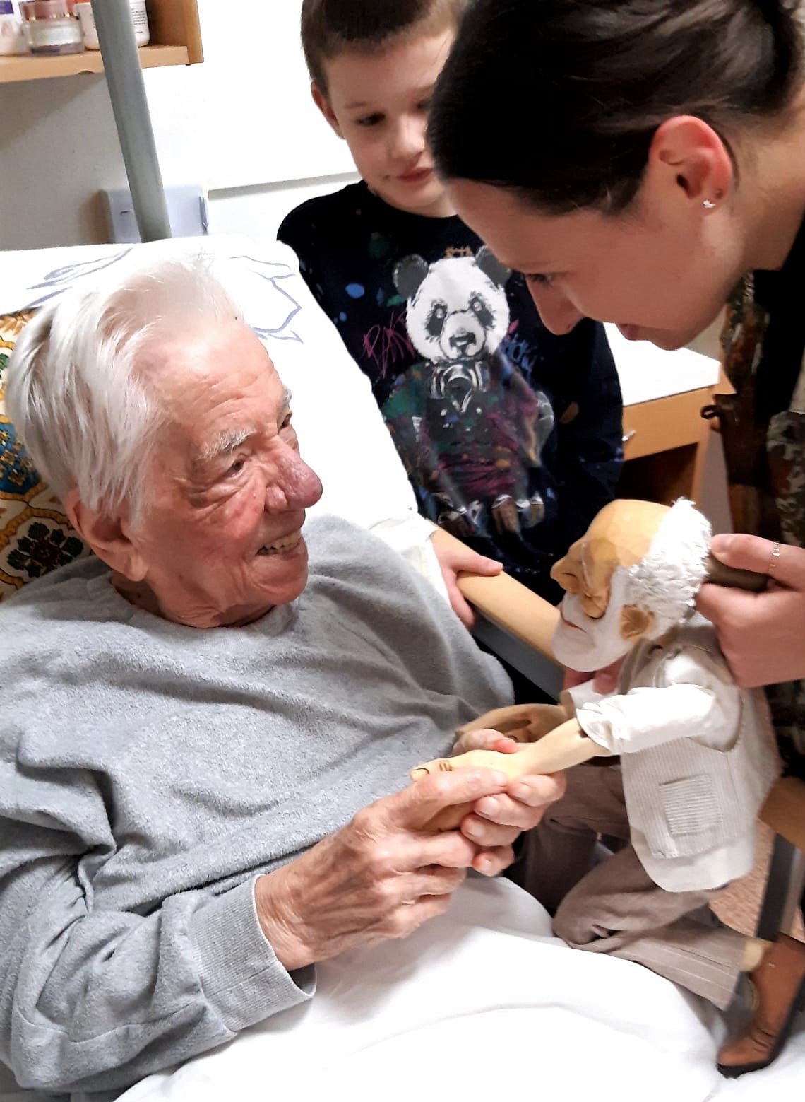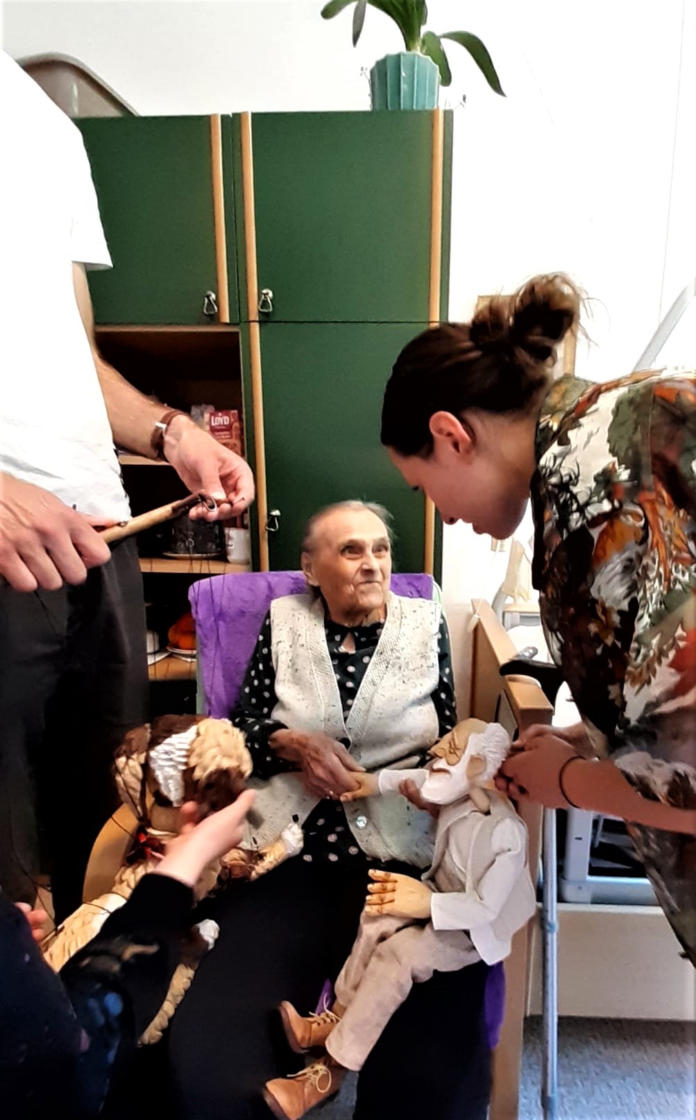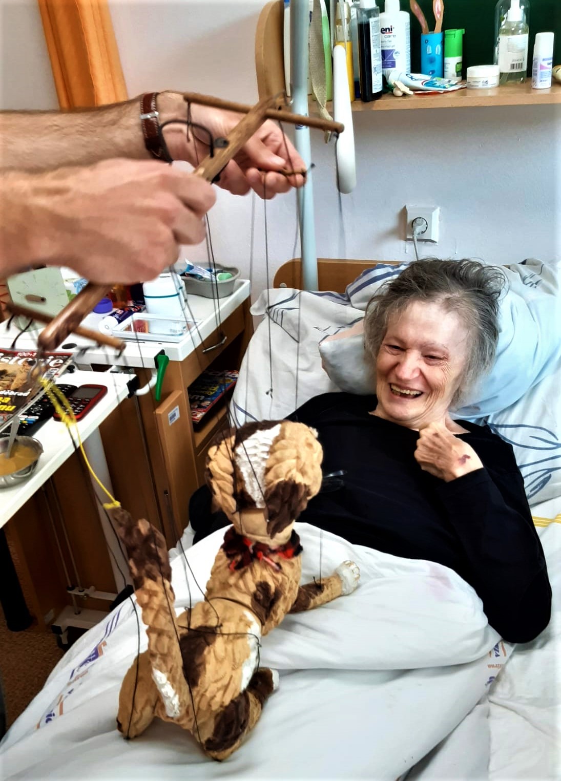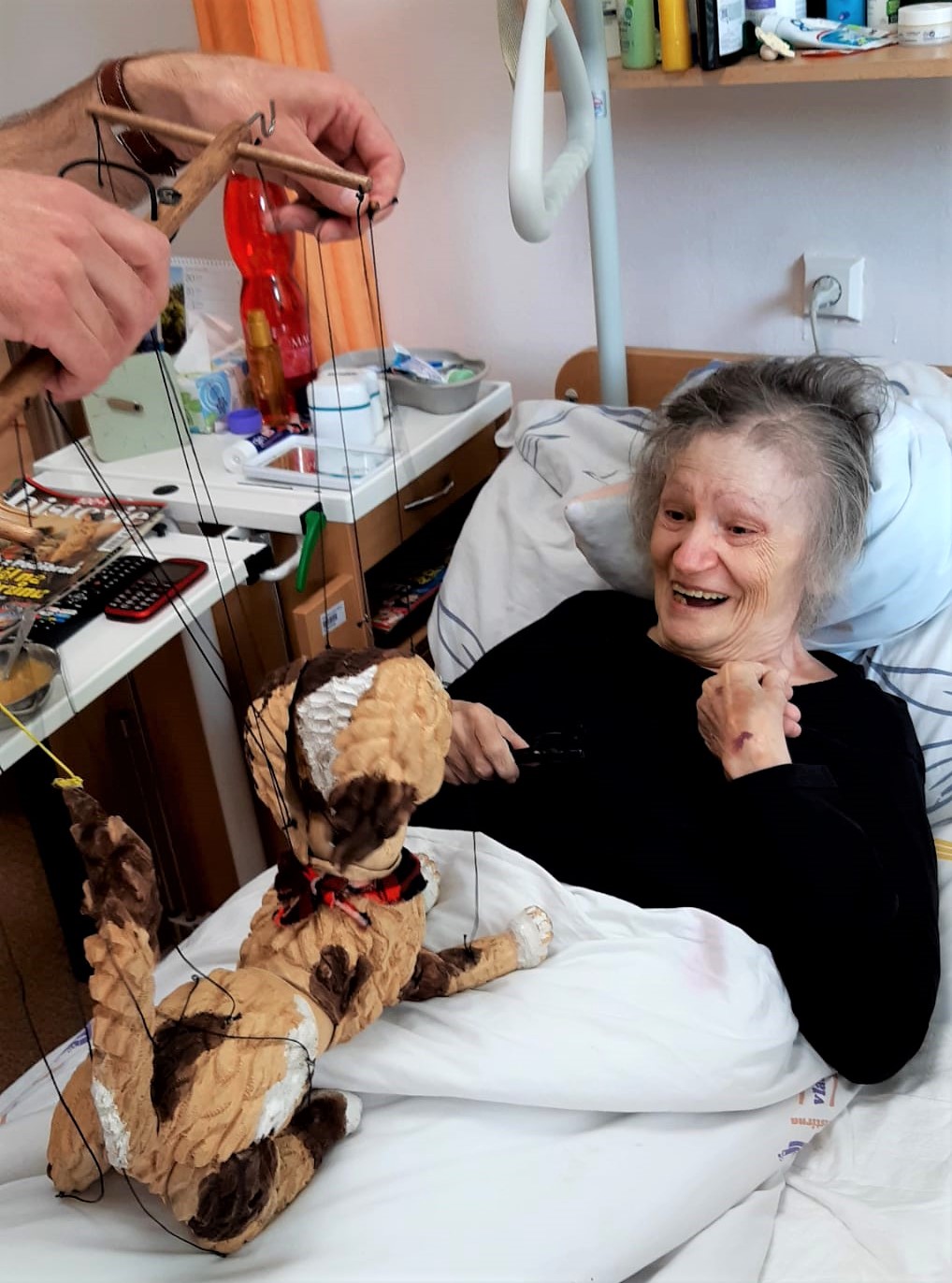 Na pokojích oddělení B1, B2 a B3 probíhala s loutkami individuální aktivizace. Klienti reagovali na dřevěné kamarády a jejich životní příběh s nadšením, úsměvy na tváři klientů toho byly důkazem.