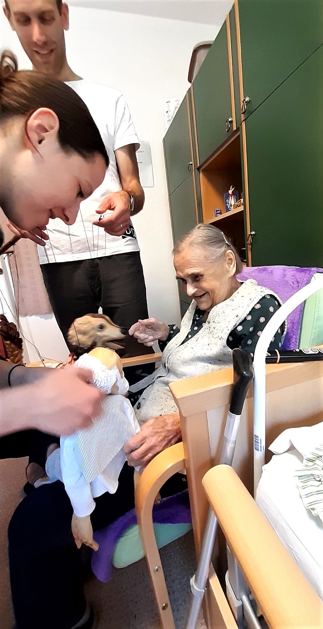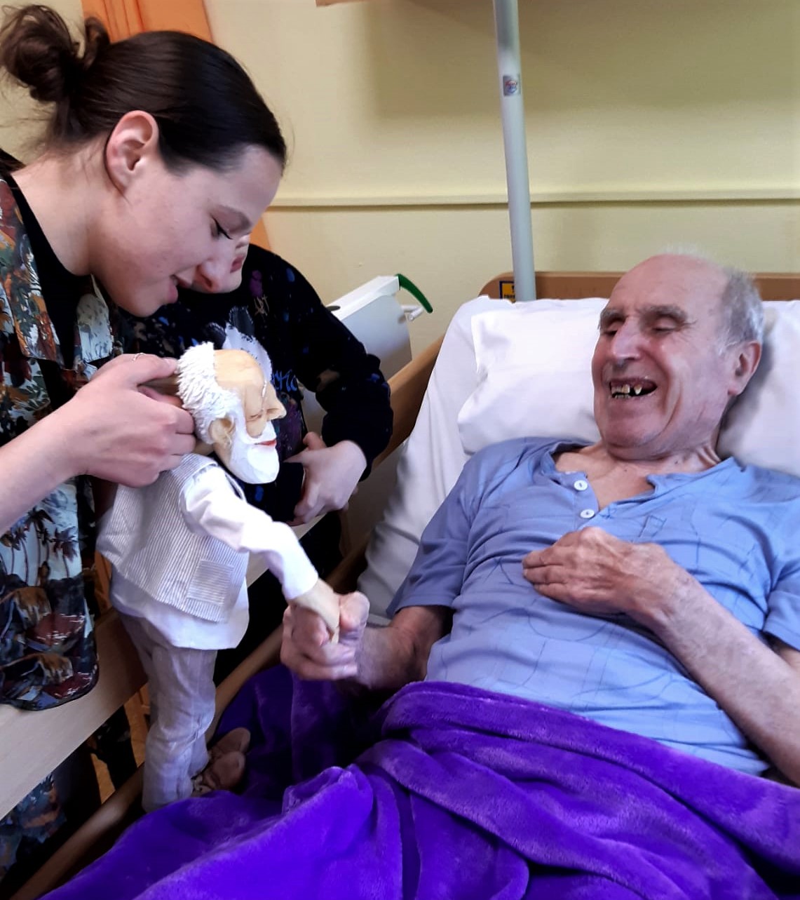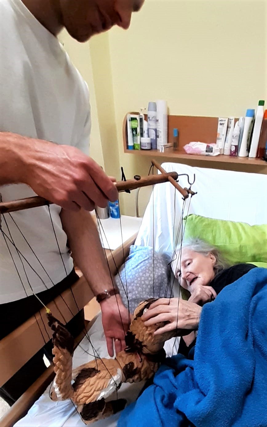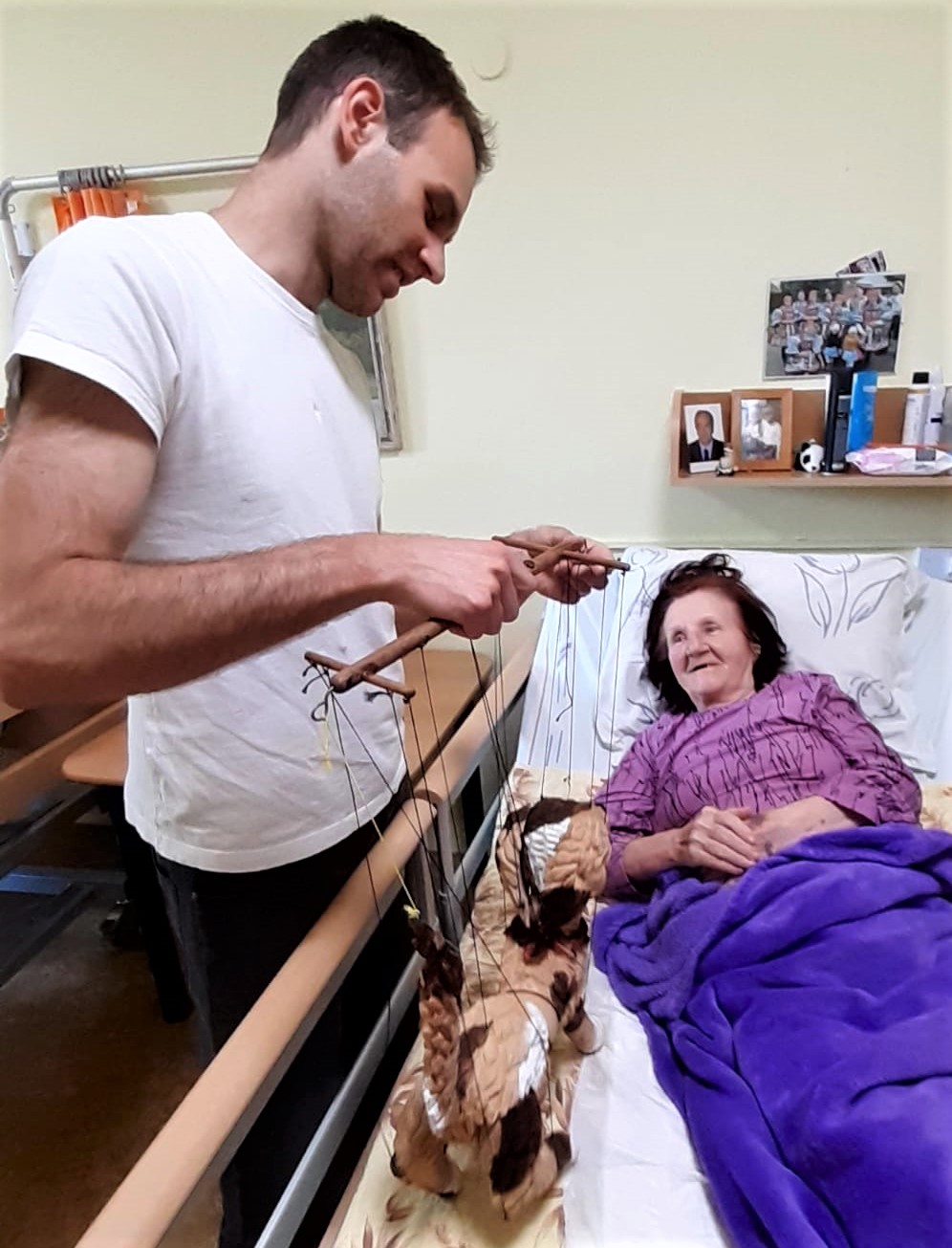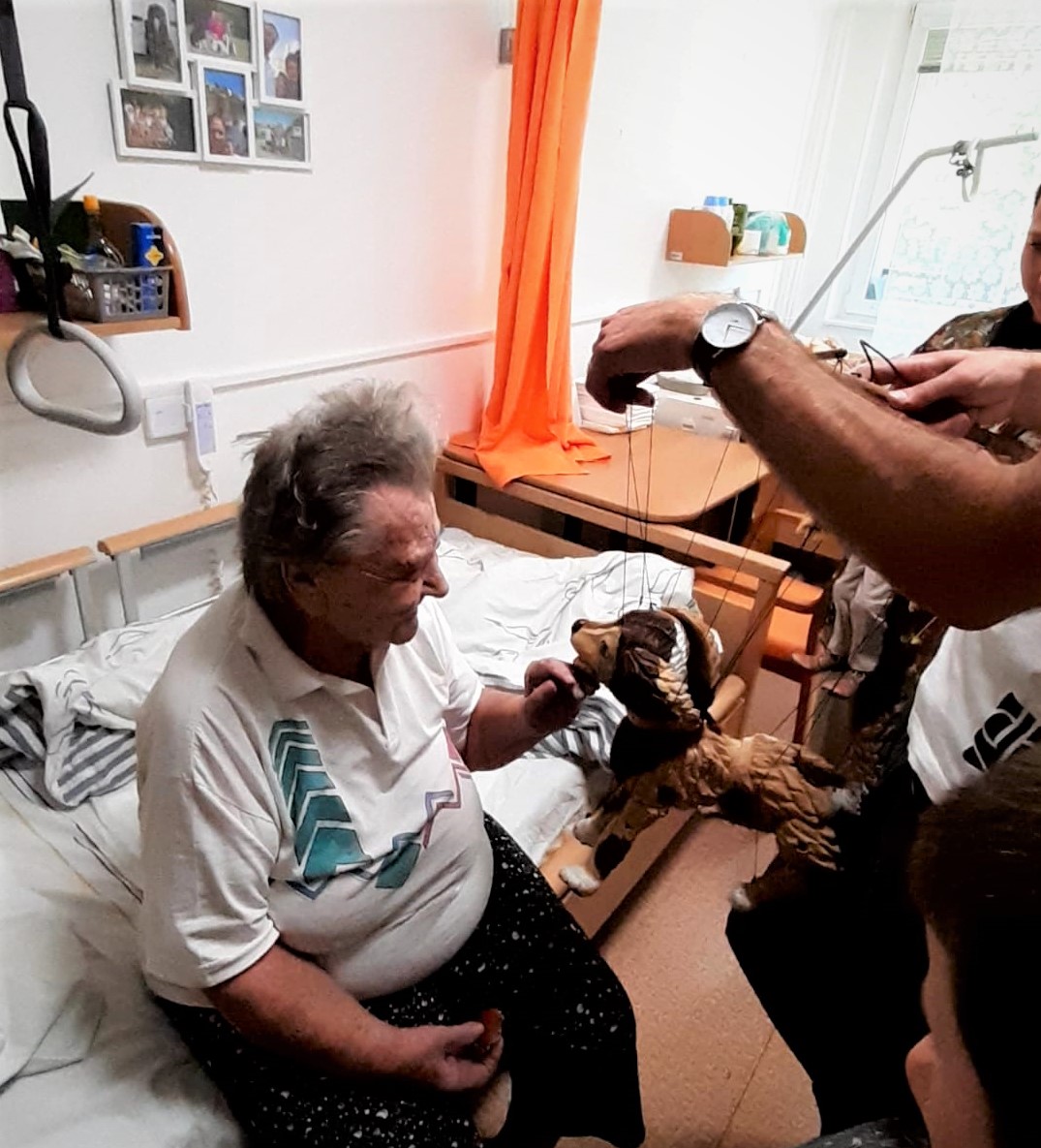 Na pokojích oddělení B1, B2 a B3 probíhala s loutkami individuální aktivizace. Klienti reagovali na dřevěné kamarády a jejich životní příběh s nadšením, úsměvy na tváři klientů toho byly důkazem.