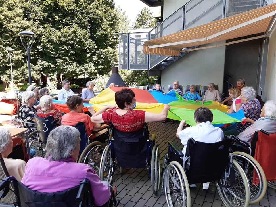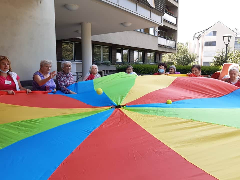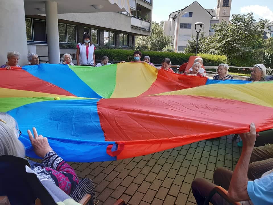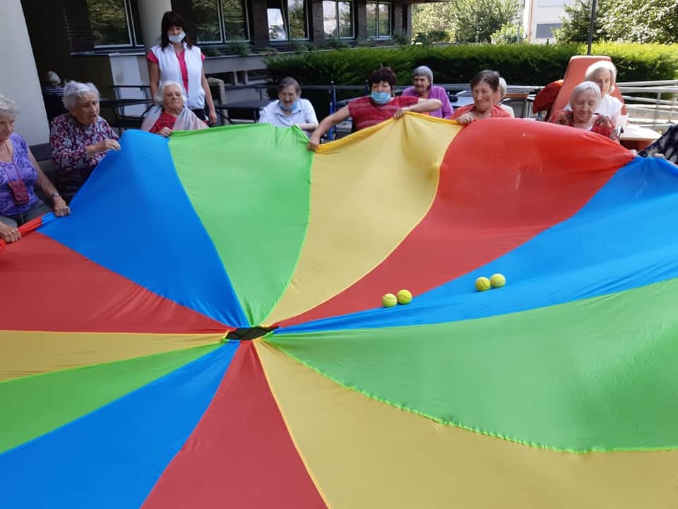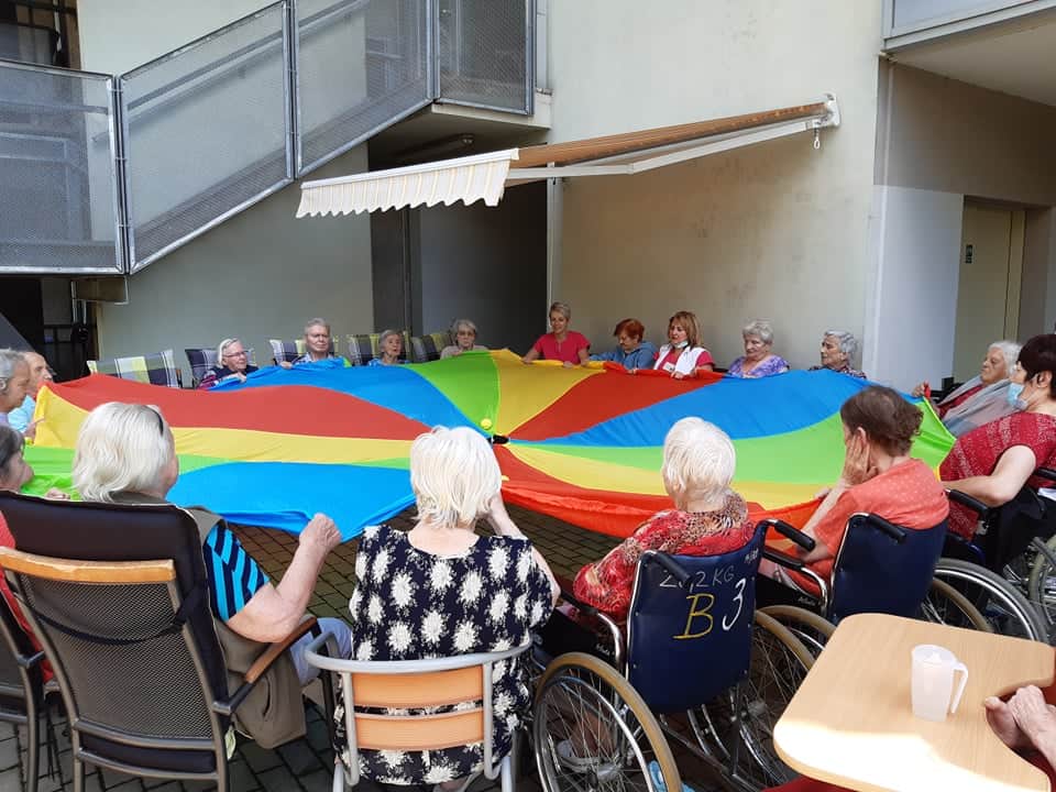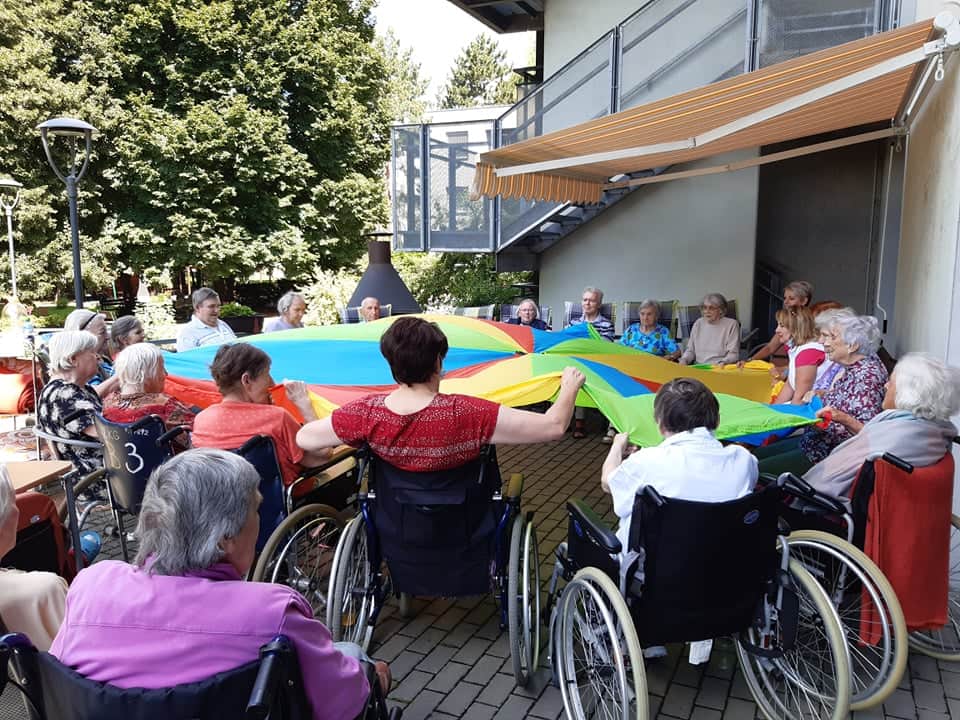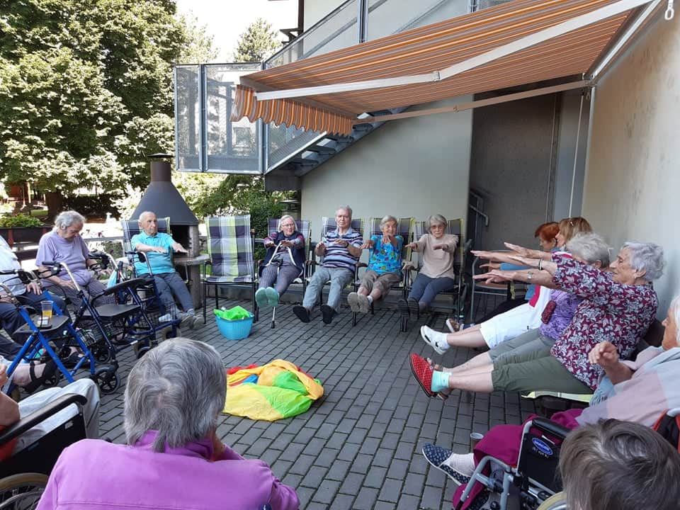 Dnes klienti cvičili na terase, při krásném počasí to byla o to větší zábava, a protože je venku dobře, tak trénovali také paměť a cvičení s padákem.