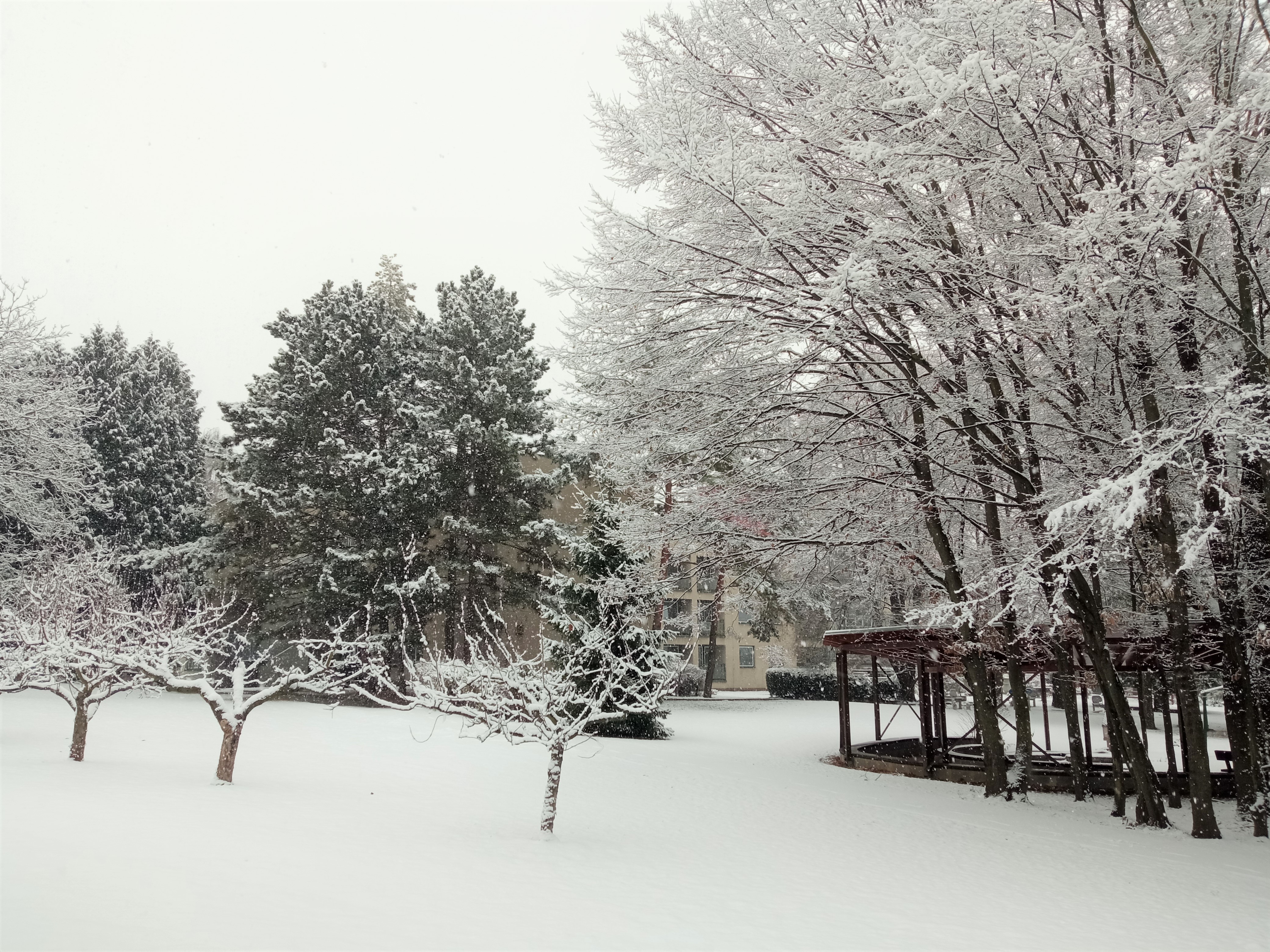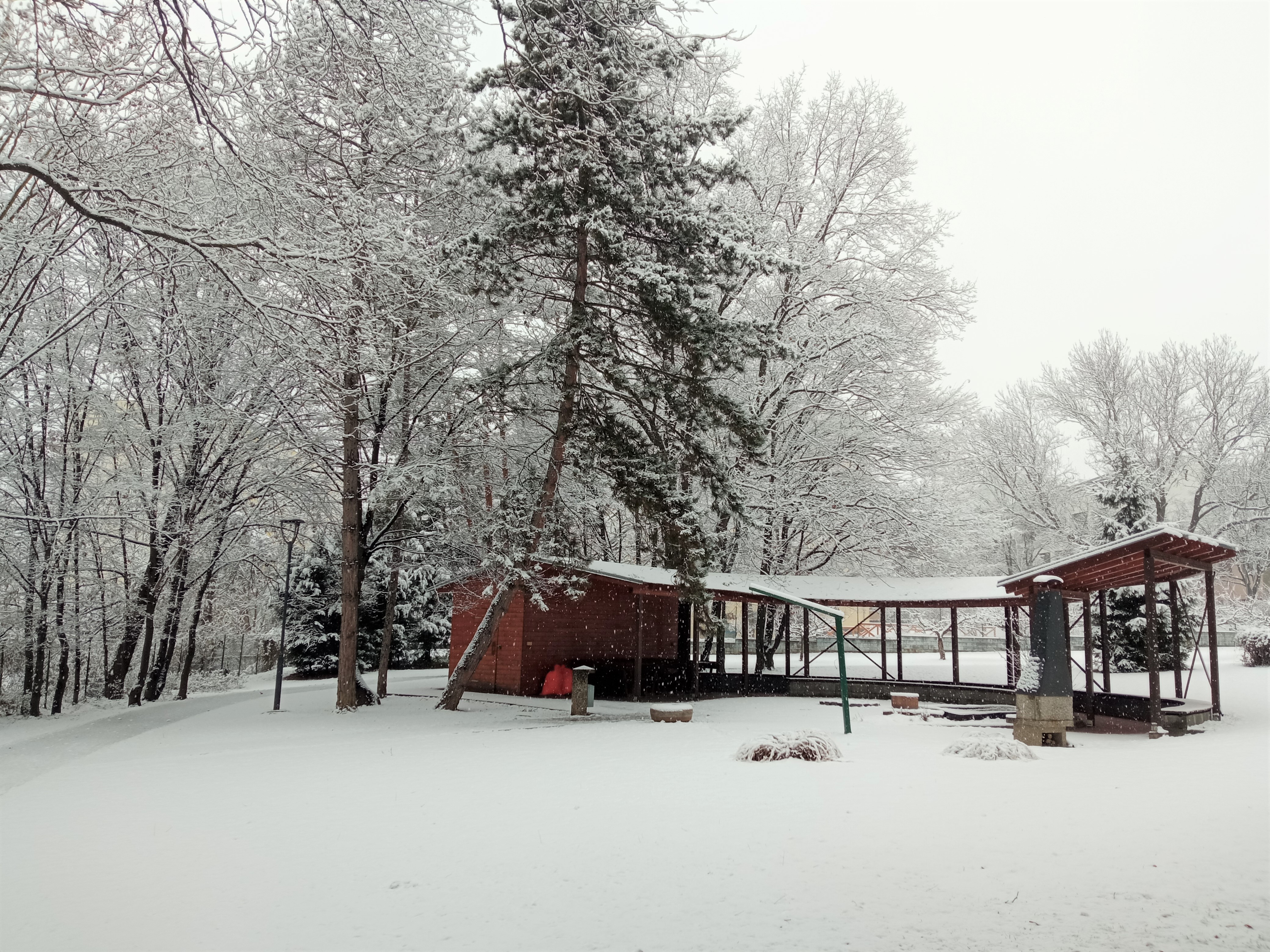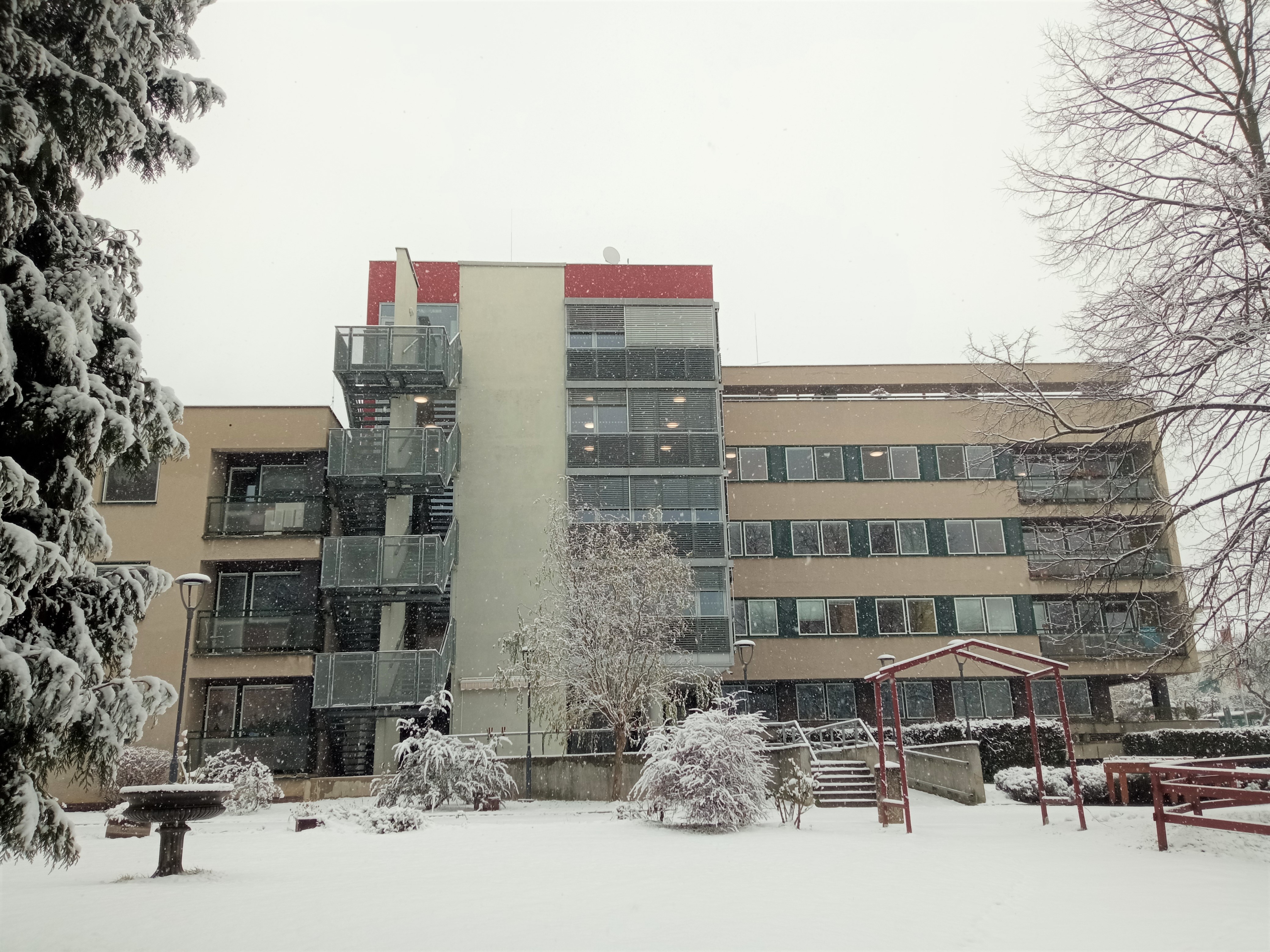 Paní ZIMA přikryla zahradu domova bílou sněhovou peřinou. Naši klienti se radují romantickým pohledem na zahradu z oken domova.