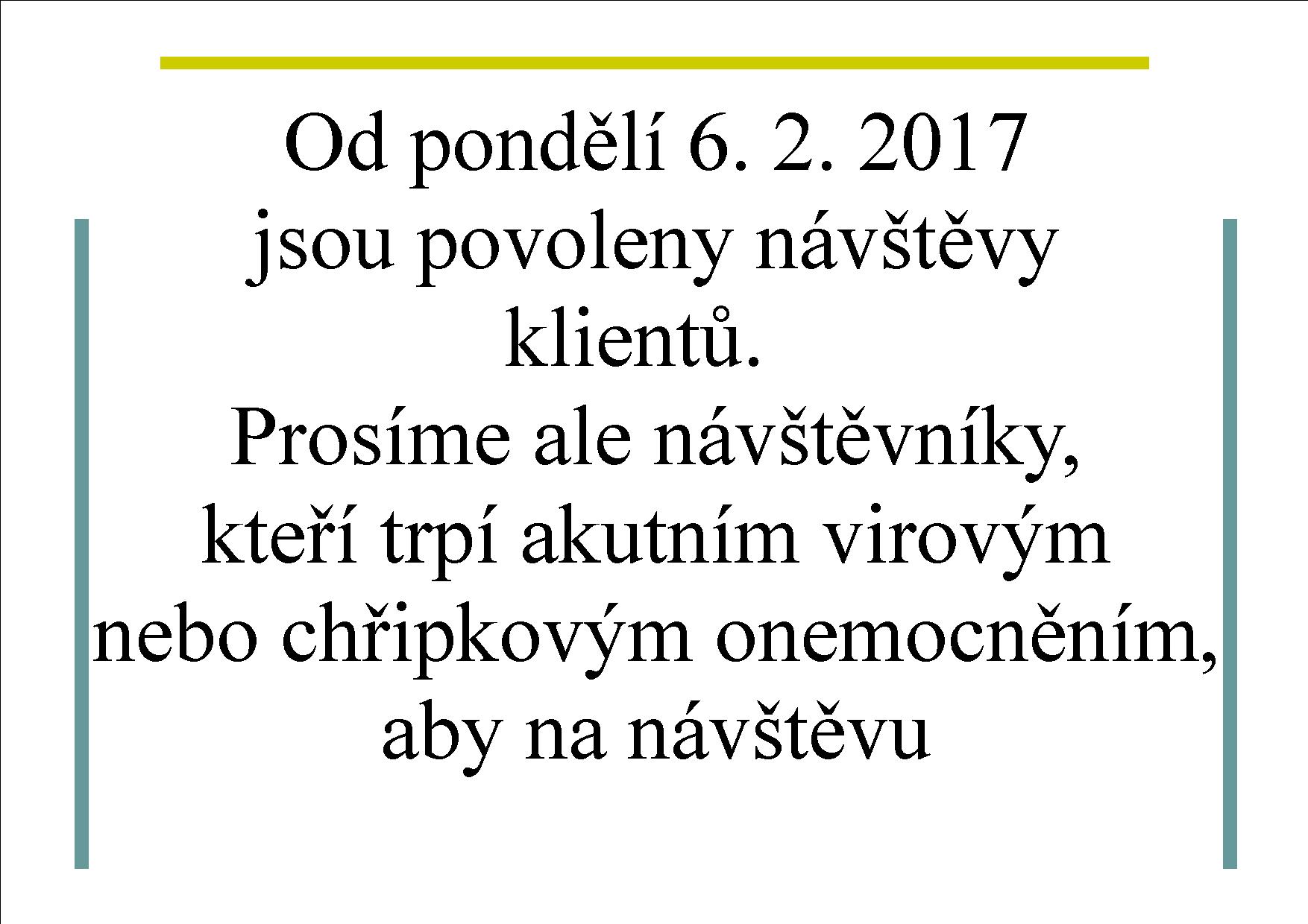 Od pondělí 6. 2. 2017 jsou povoleny návštěvy klientů.