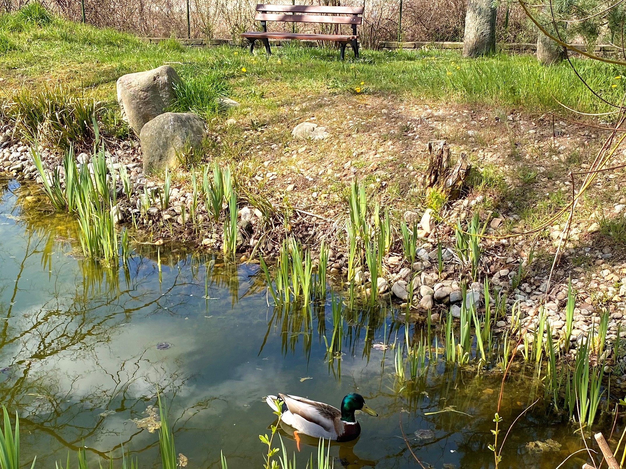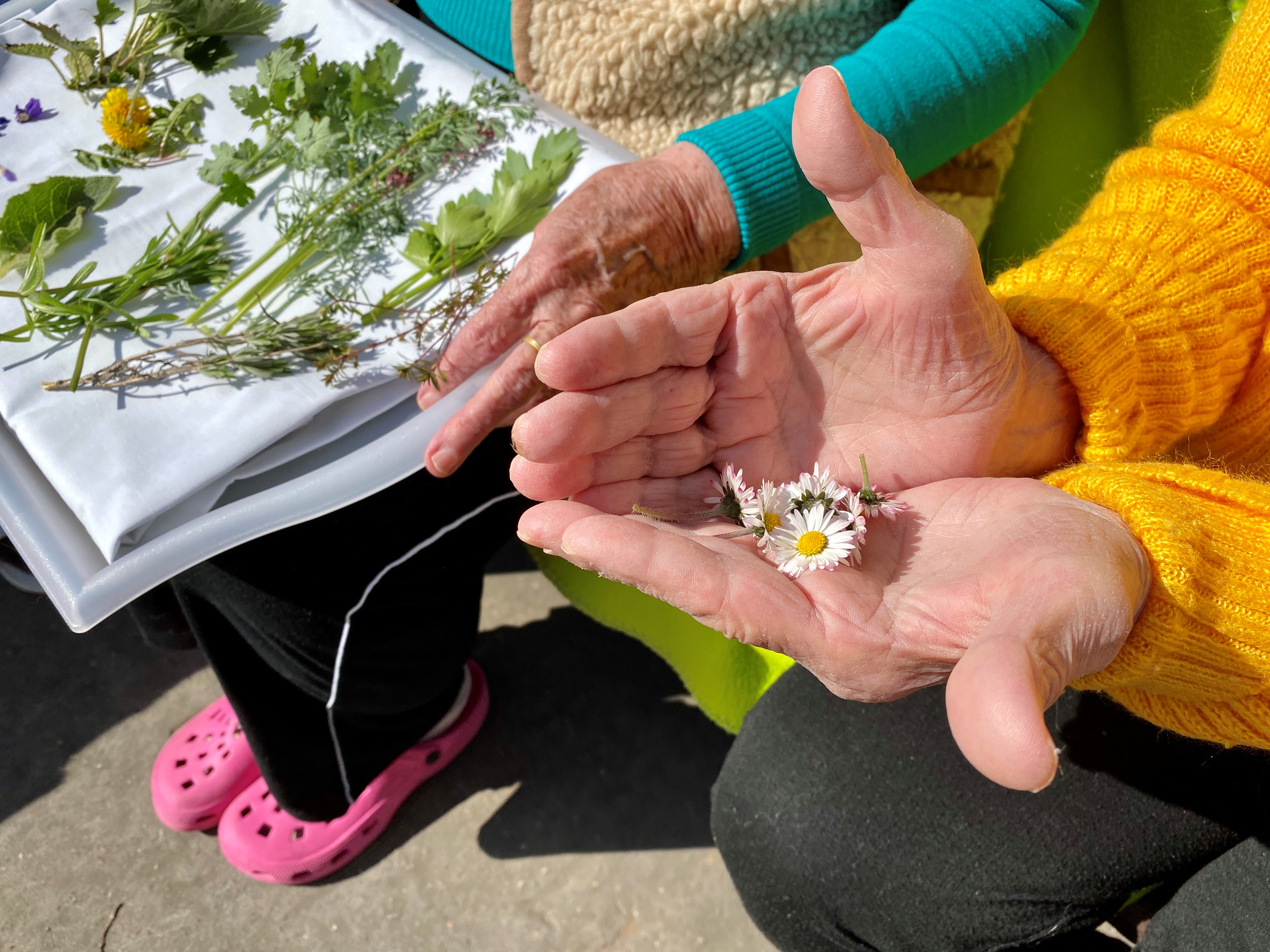 Procházeli jsme se po zahradě, nasbírali jsme bylinky, které na naší zahradě rostou (pampeliška, sedmikráska, zemědým, kopřiva...). V truhlíku a na záhonu se začíná zelenat nať levandule, tymián a libeček. Poznávali a popisovali jsme natrhané rostliny, společně vzpomínali na jejich využití v domácnosti. Při posezení na lavičce jsme připravovali vlnu na háčkování. Po očku nás sledoval kačer z rybníčku.