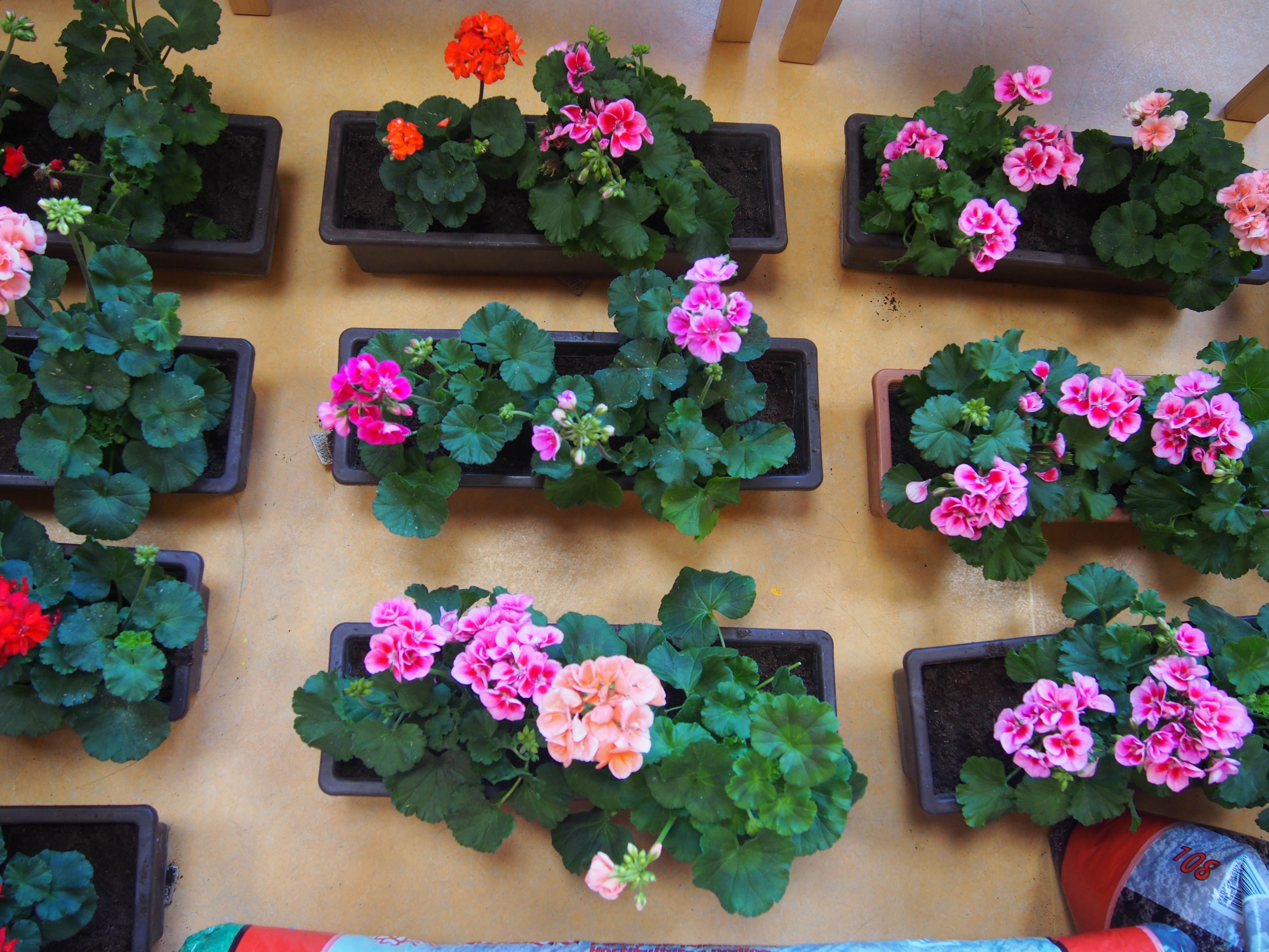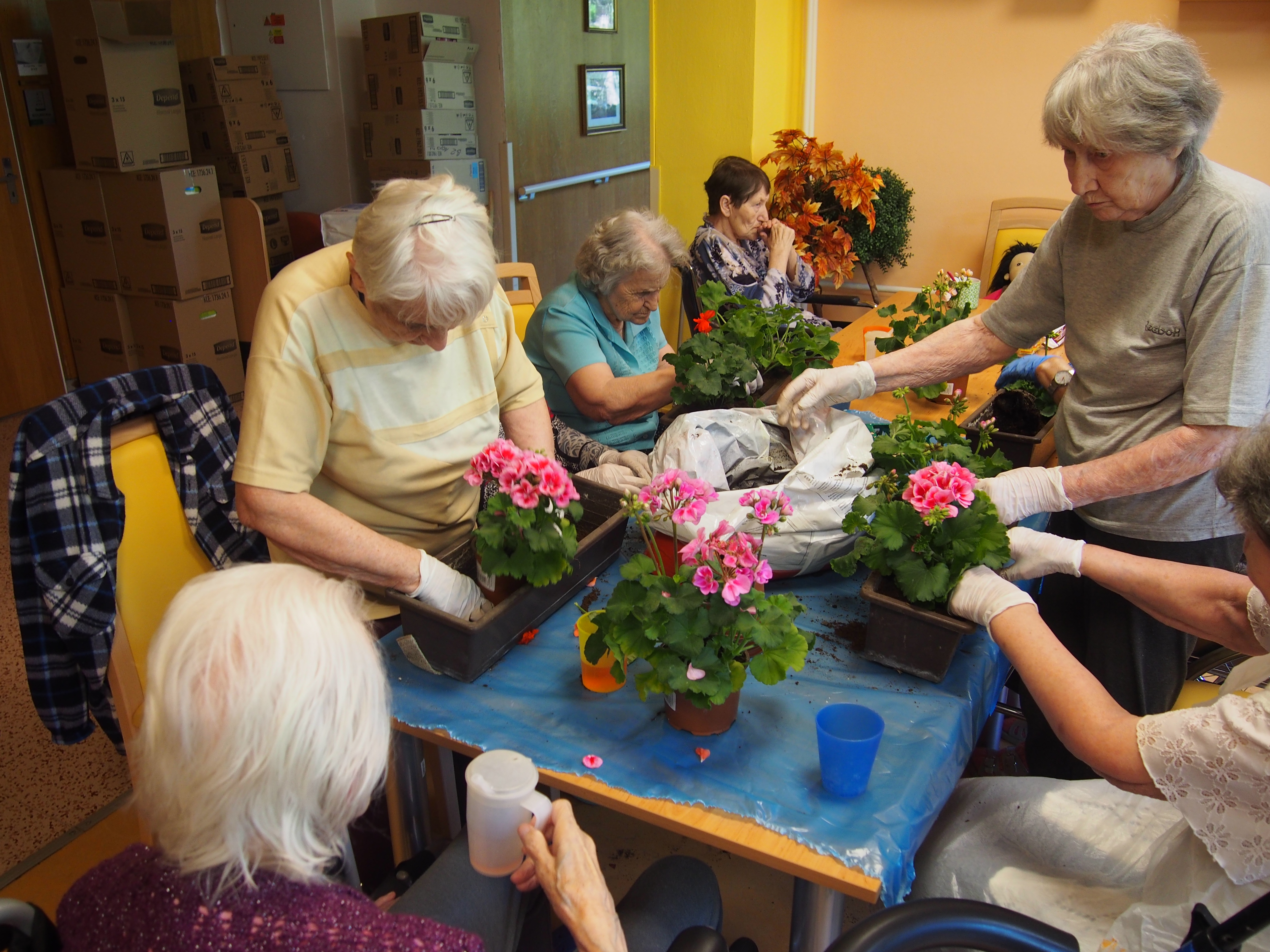 Klienti společně s aktivizačními pracovníky sázeli muškáty. Květiny jim budou dělat radost až do podzimu.